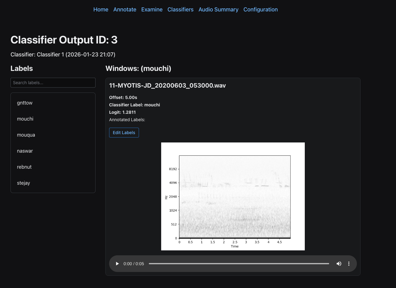 data_diris the directory used to setup a project.labelis the label you want to get classifier outputs for.min_logitis the minimum logit you want to filter the classifier outputs by.max_logitis the maximum logit you want to filter the classifier outputs by.classifier_output_idis the id of the classifier output, which can be found by clicking on a classifier in theClassifierstab in the GUI.num_windowsis the maximum number of windows to sample. Defaults to 1.