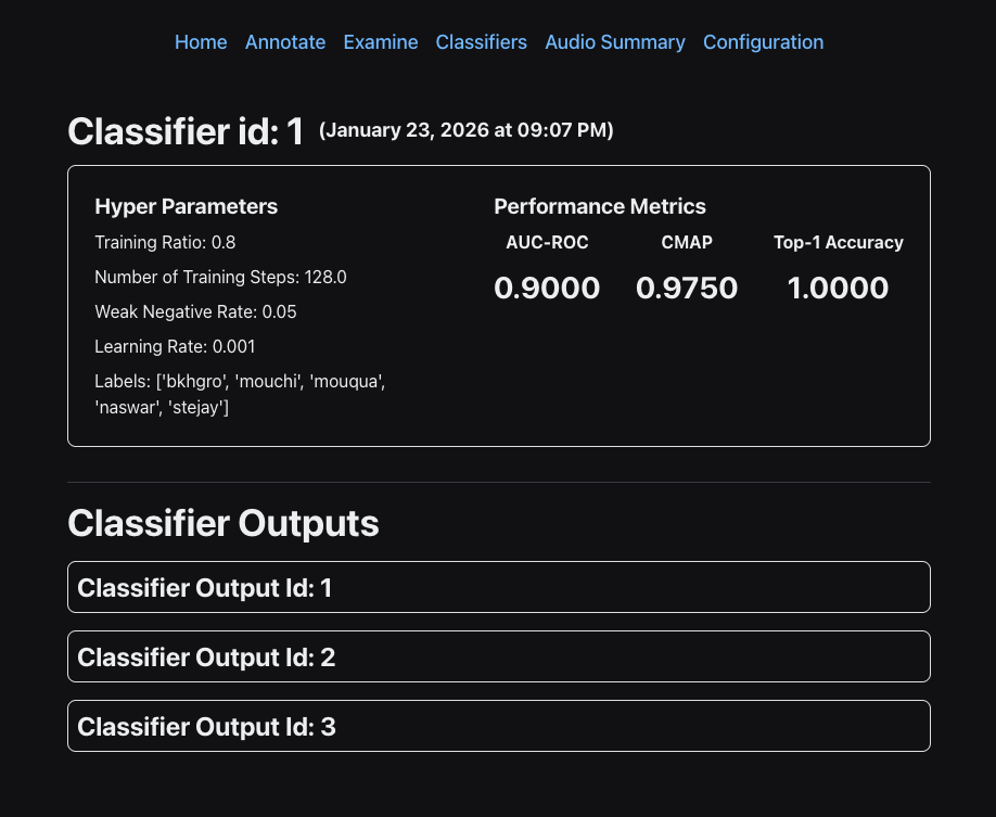 This generates a classifier, which you can run on your ARU data using the method shown below. Because we partition our data into train/test sets, we have metrics on the quality of our classifier. These metrics can be viewed using the Classifiers tab in the GUI.